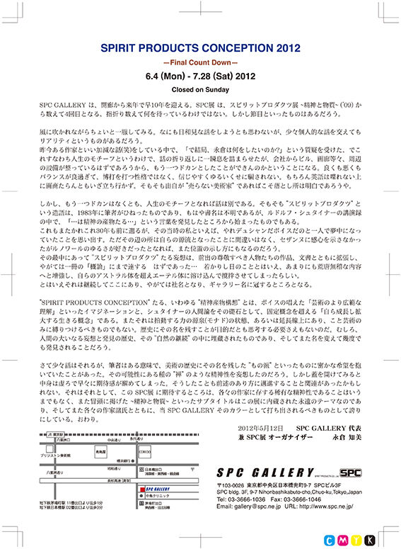 SPC GALLERY は、開廊から来年で早10年を迎える。SPC展 は、スピリットプロダクツ展 ~精神と物質~ (’09) から数えて4回目となる。指折り数えて何を待っているわけではない。しかし節目といったものはあるだろう。