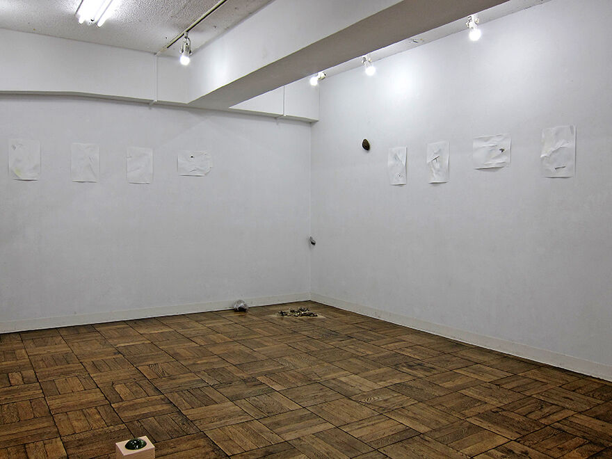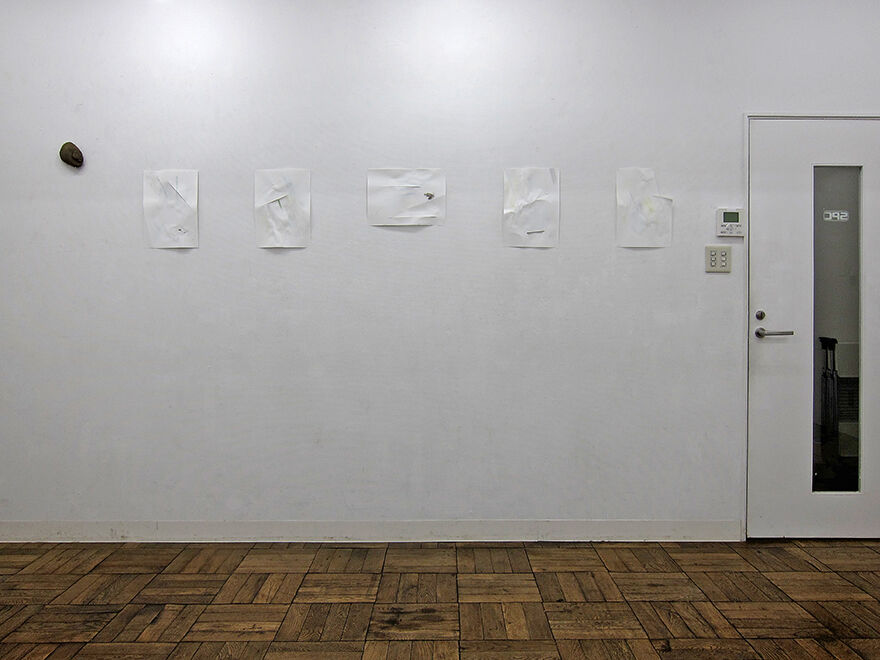竹内 博 《風》 紙にドローイング, 壁, 床に自然石をラッピング, セロテープ, 粉塵等 / 平面, インスタレーション