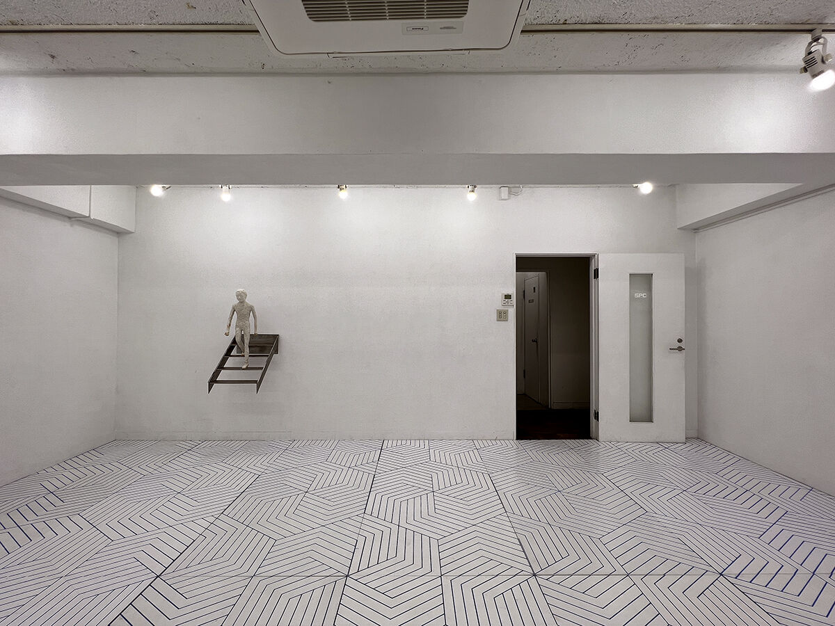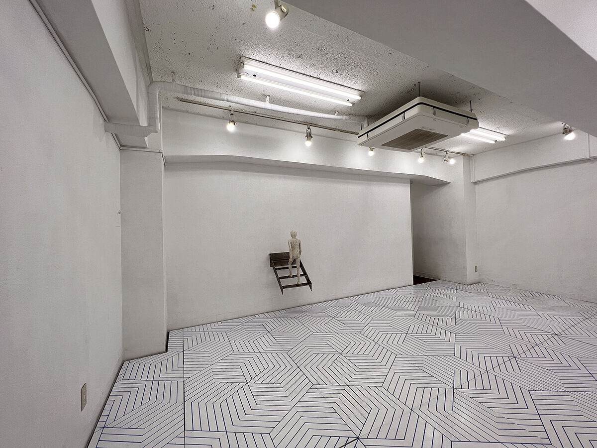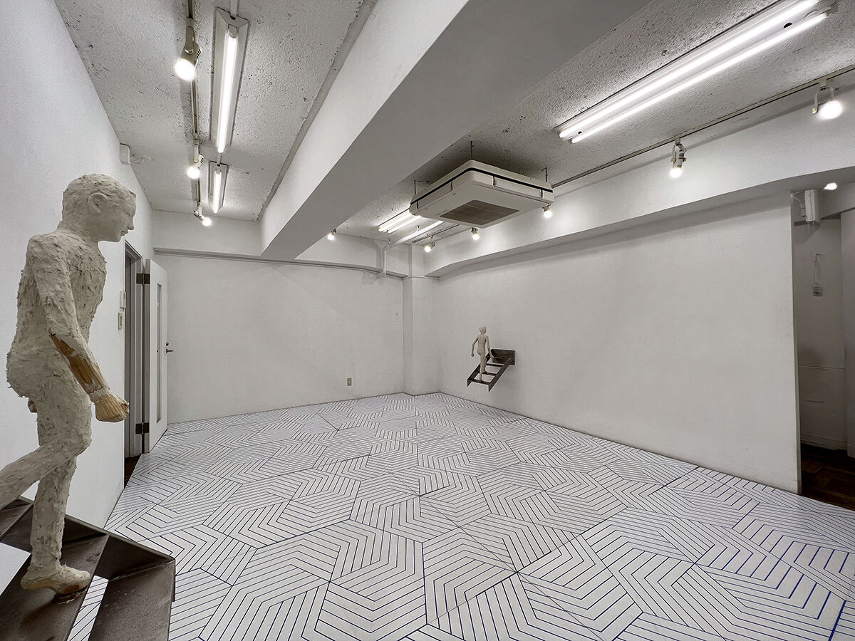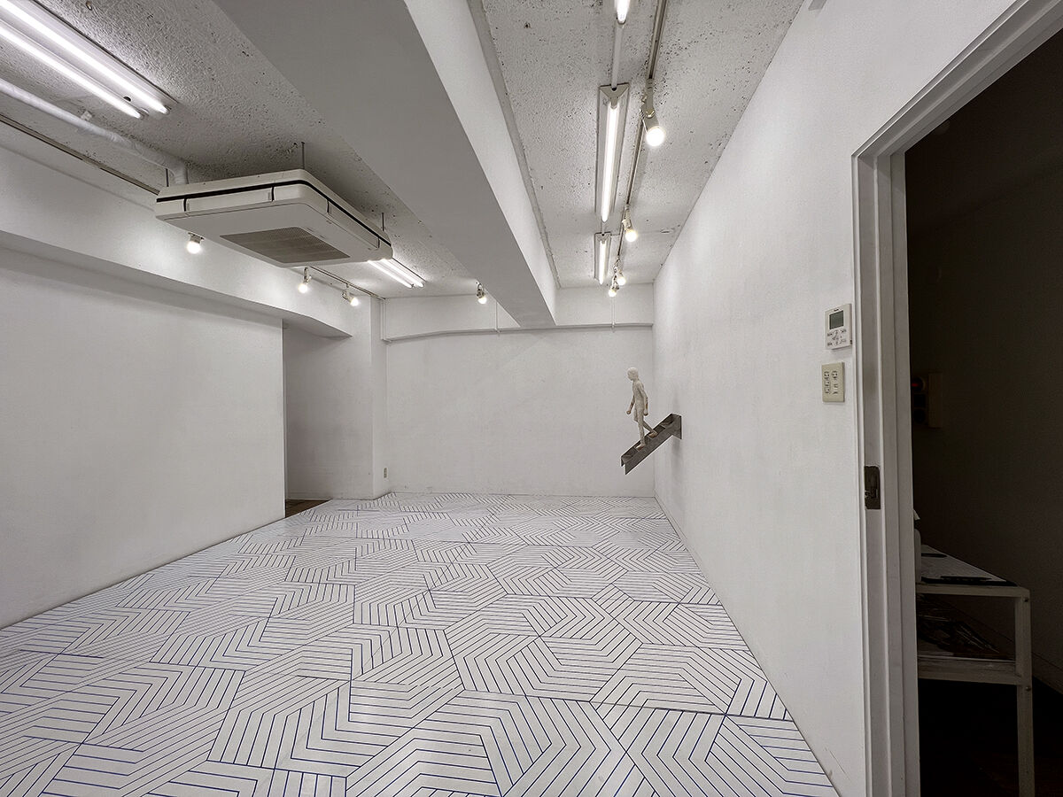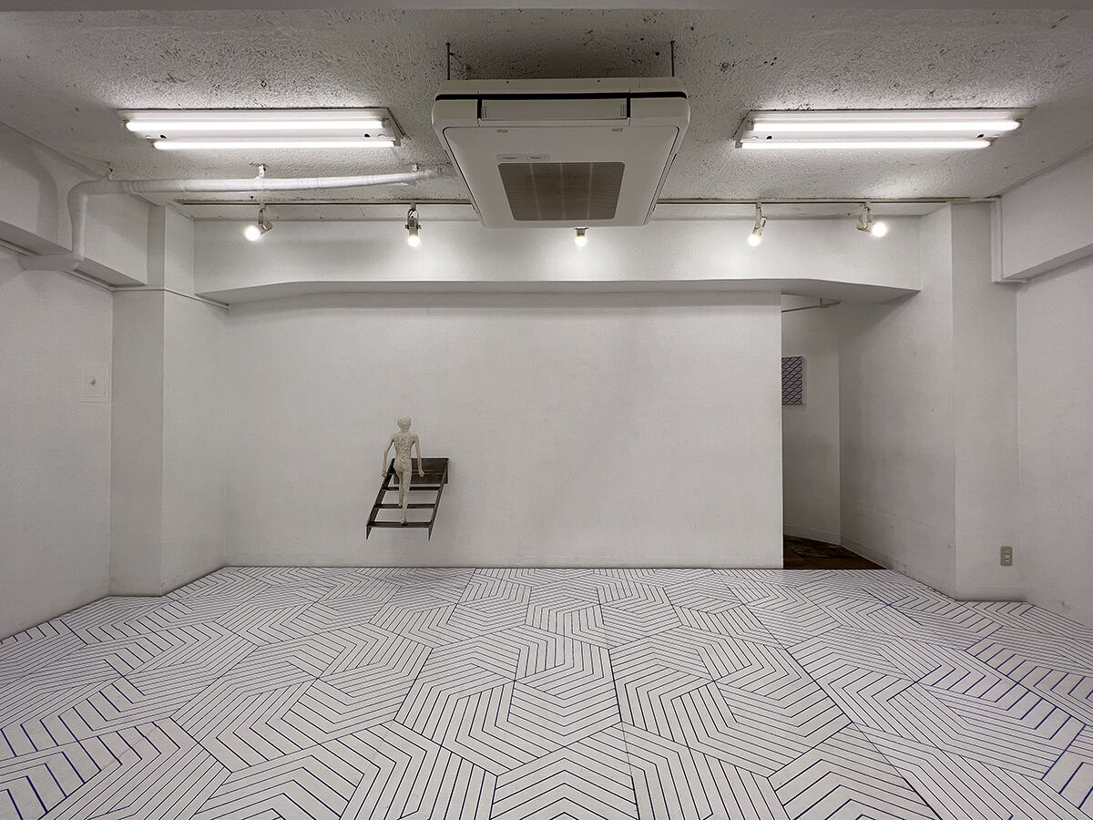 中川 猛 《 NEOZIGGURAT Ⅶ Antinomy 》 床にベニヤ, ジェッソ, 油性マーカー, コート剤. 鉄, 角材に粘土. キャンバスにアクリル. / インスタレーション