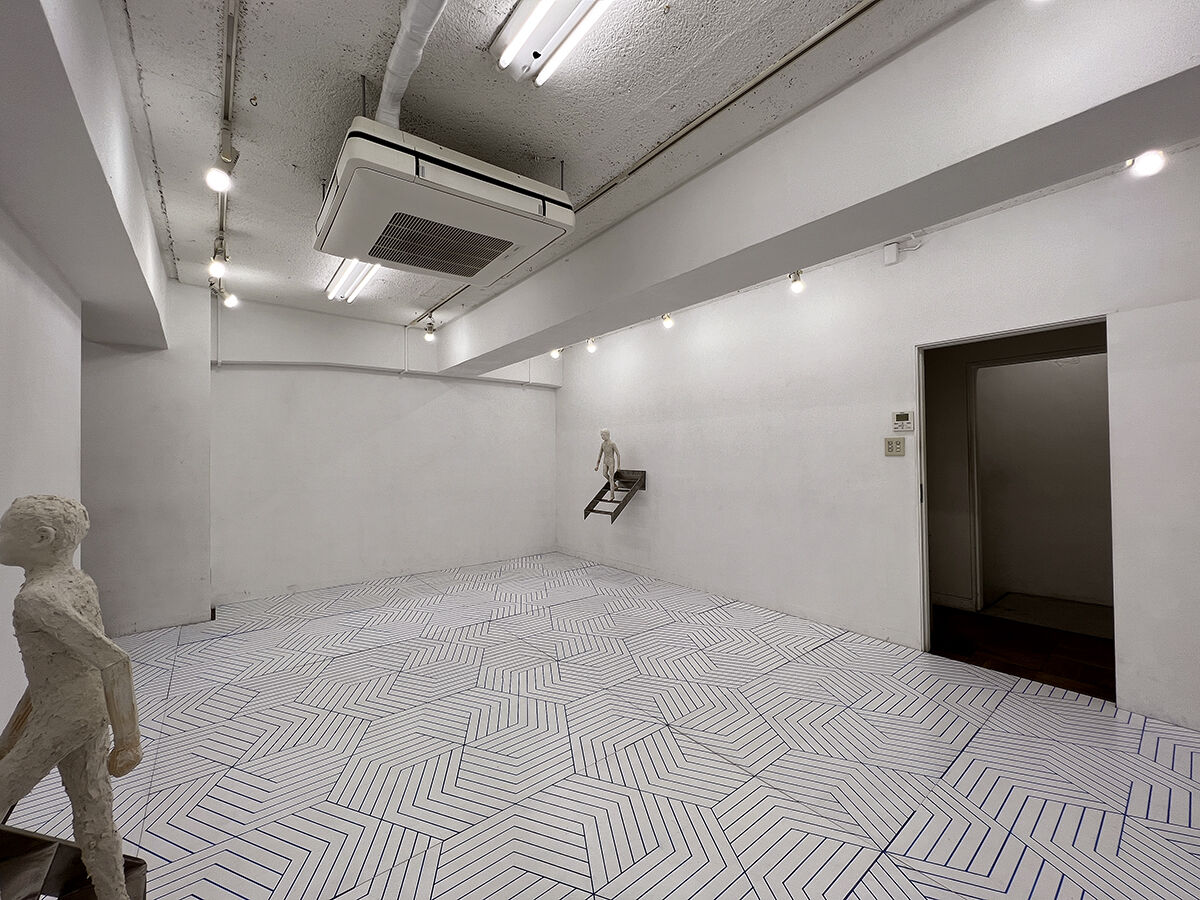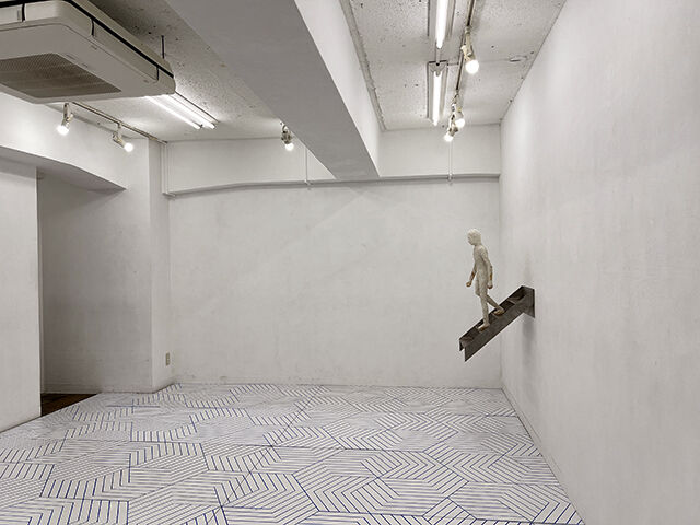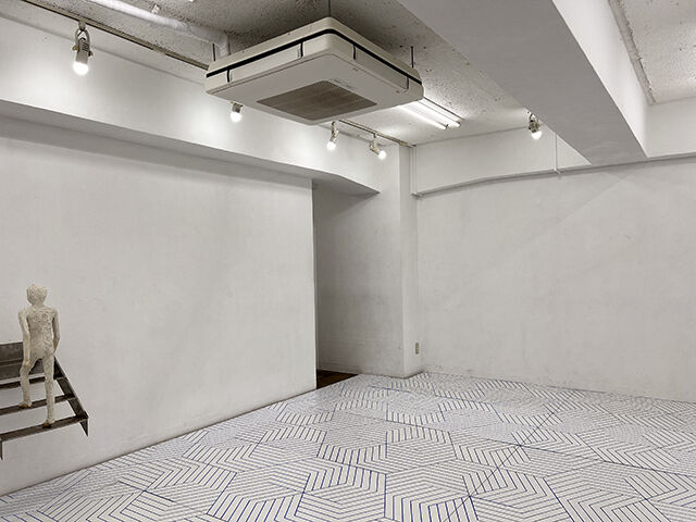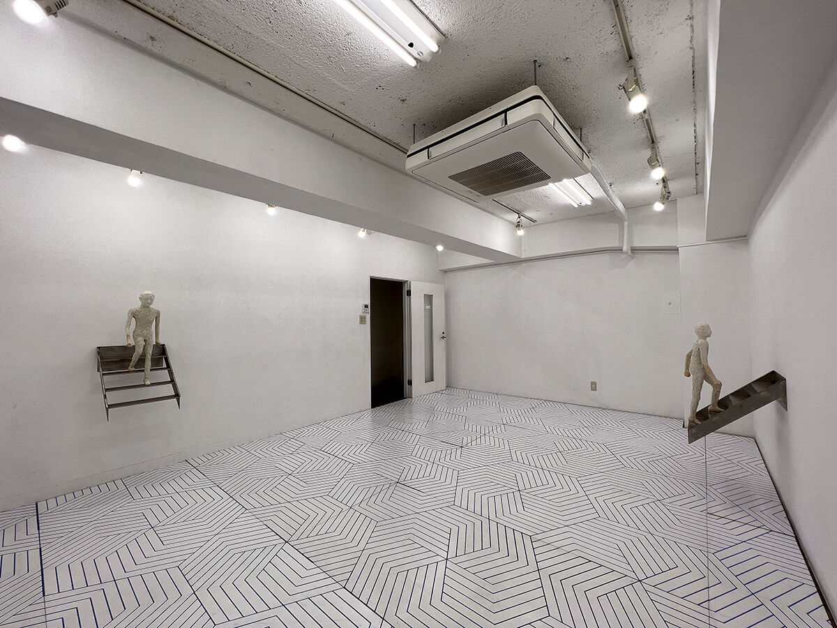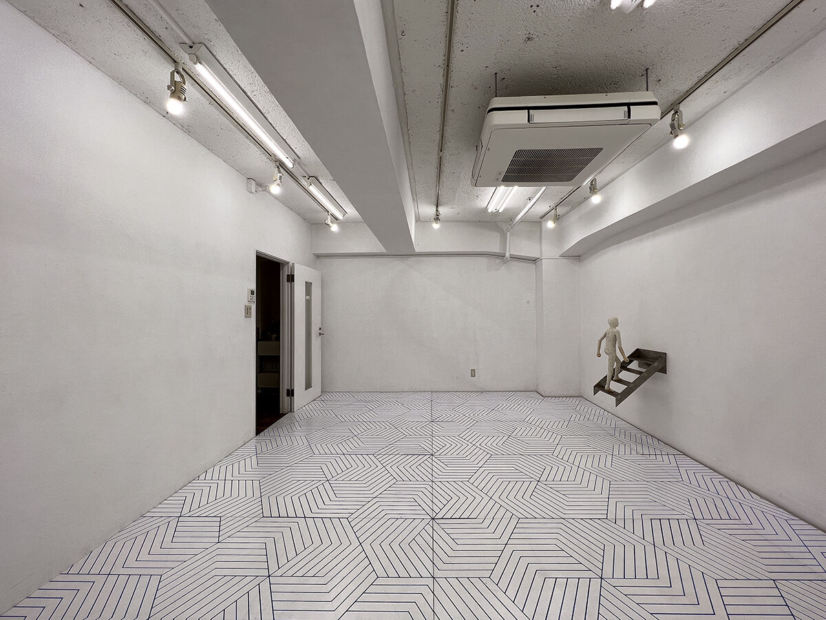 中川 猛 《 NEOZIGGURAT Ⅶ Antinomy 》 床にベニヤ, ジェッソ, 油性マーカー, コート剤. 鉄, 角材に粘土. キャンバスにアクリル. / インスタレーション