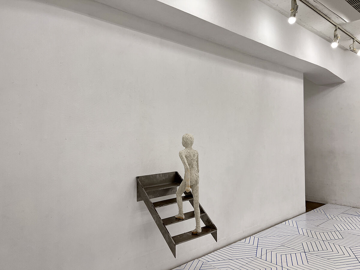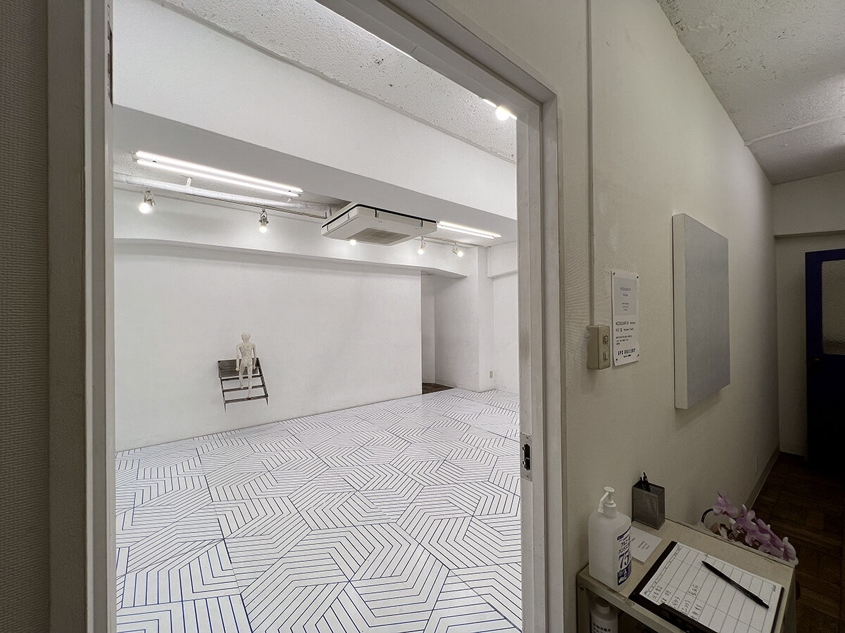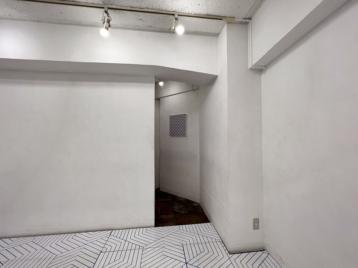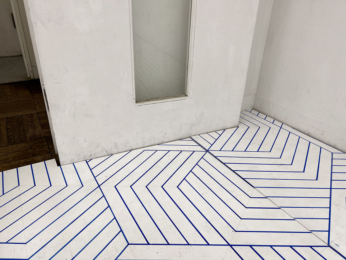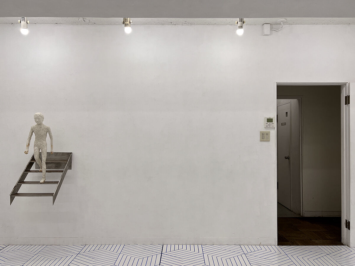 中川 猛 《 NEOZIGGURAT Ⅶ Antinomy 》 床にベニヤ, ジェッソ, 油性マーカー, コート剤. 鉄, 角材に粘土. キャンバスにアクリル. / インスタレーション