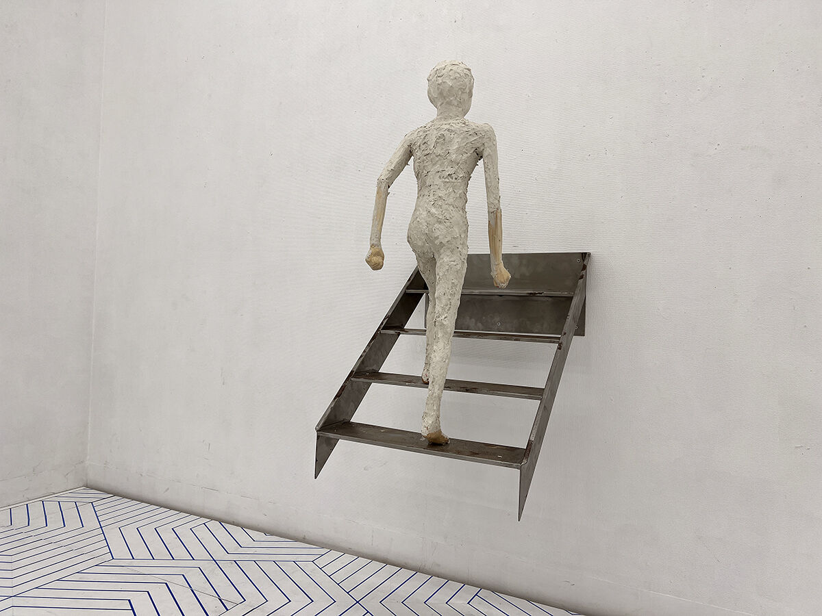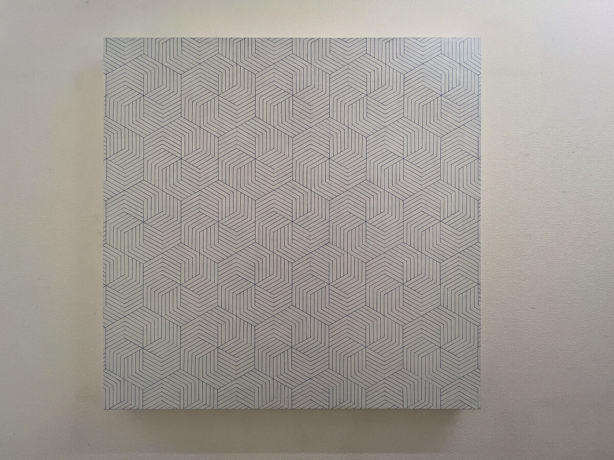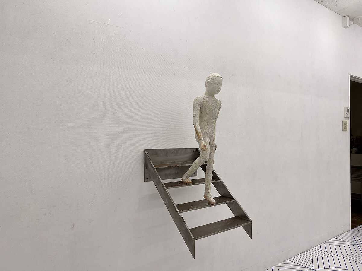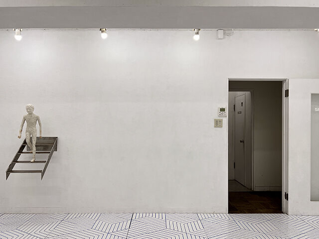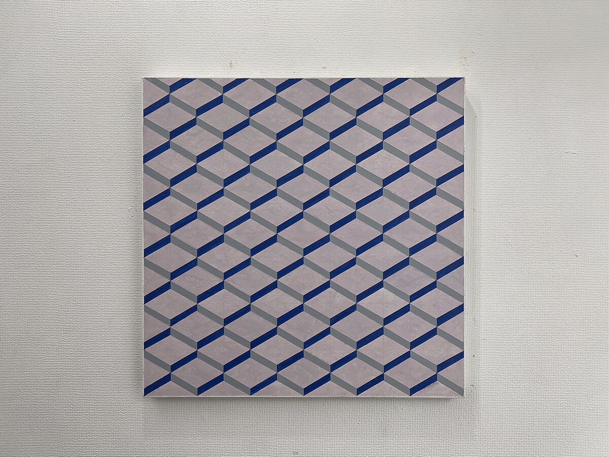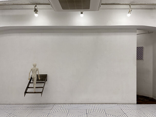 中川 猛 《 NEOZIGGURAT Ⅶ Antinomy 》 床にベニヤ, ジェッソ, 油性マーカー, コート剤. 鉄, 角材に粘土. キャンバスにアクリル. / インスタレーション
