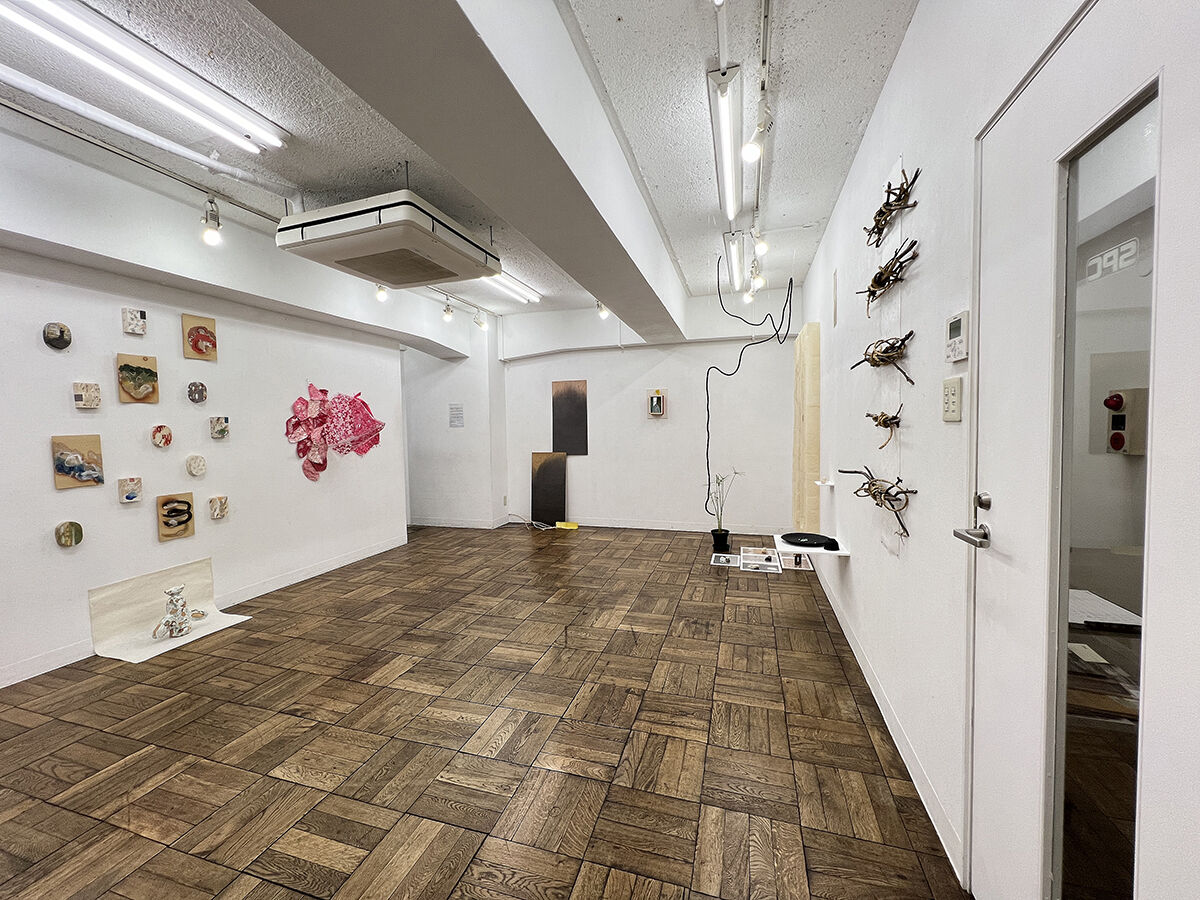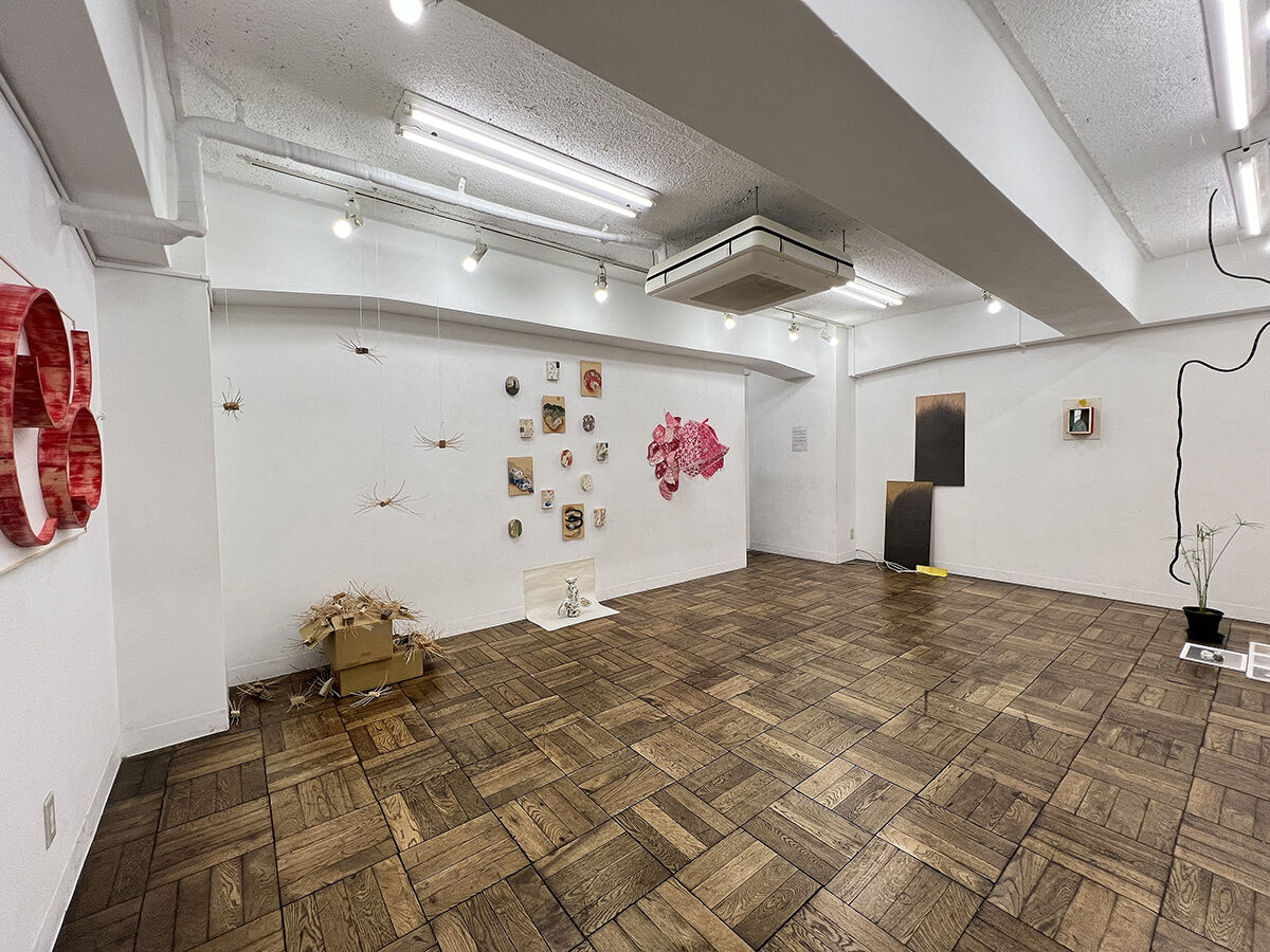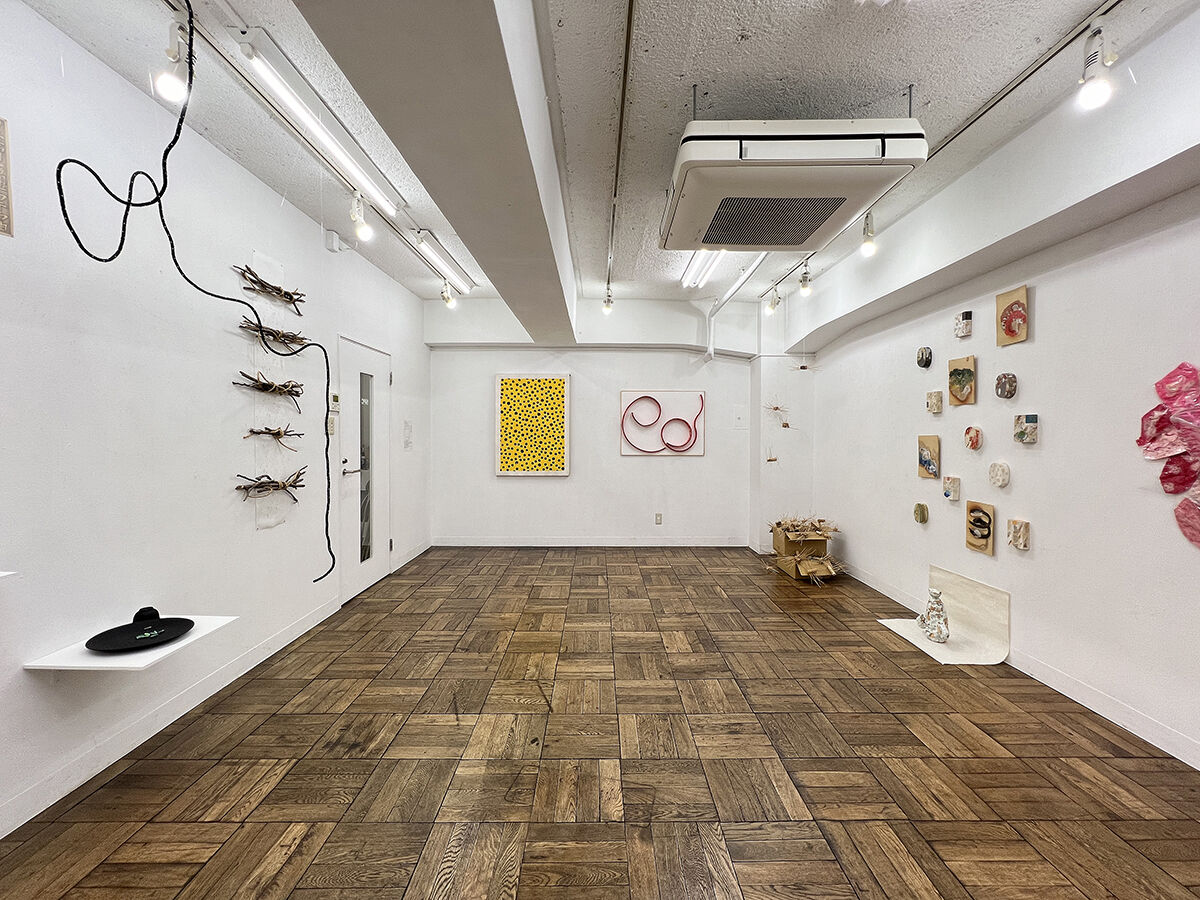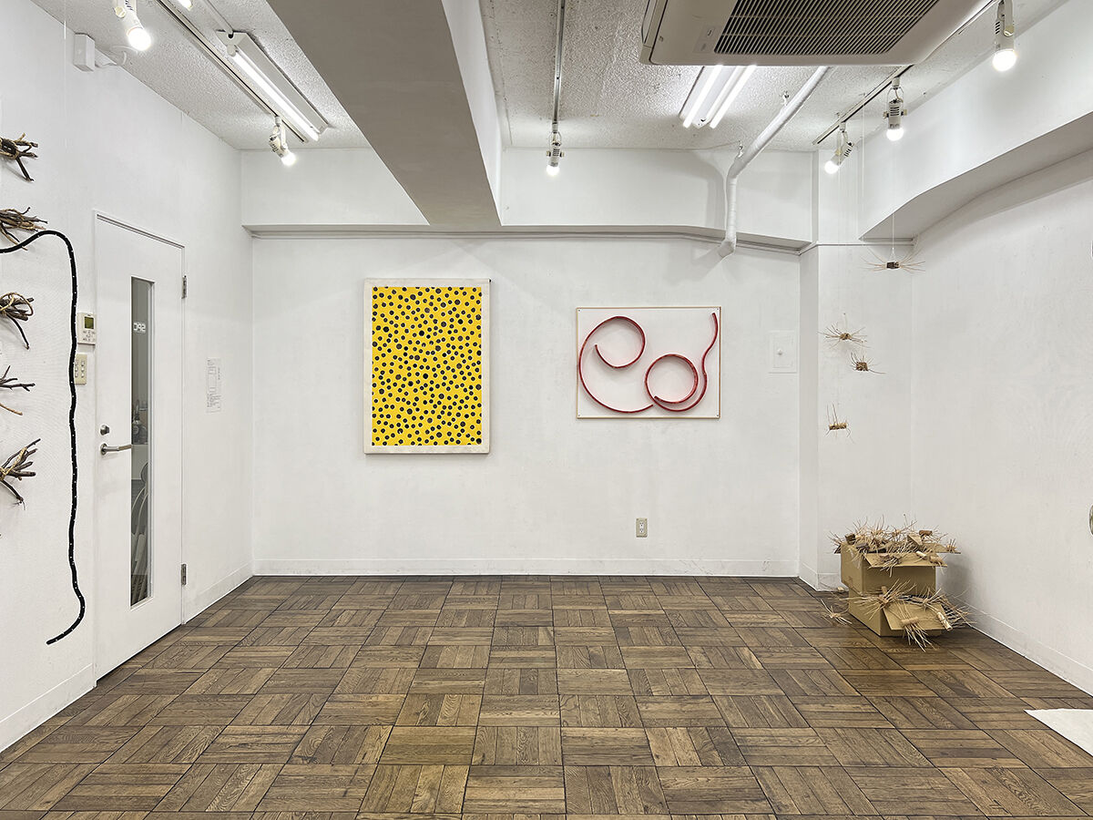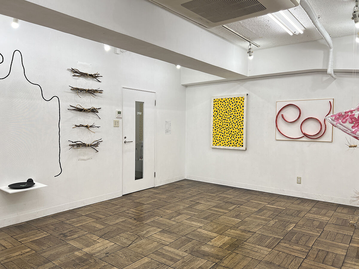 島村 宗充 《 星膏*紐宇宙 》 壁に鉛筆画, 空間に紐 《 GREEN CAPSULES〜hommage for “Silent Running” 》 壁に板, 陶器, 他 /インスタレーション