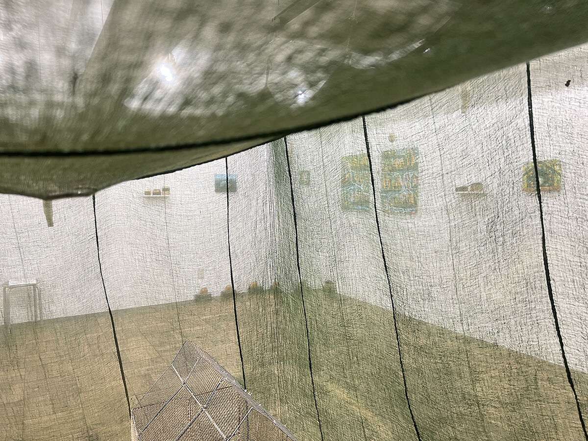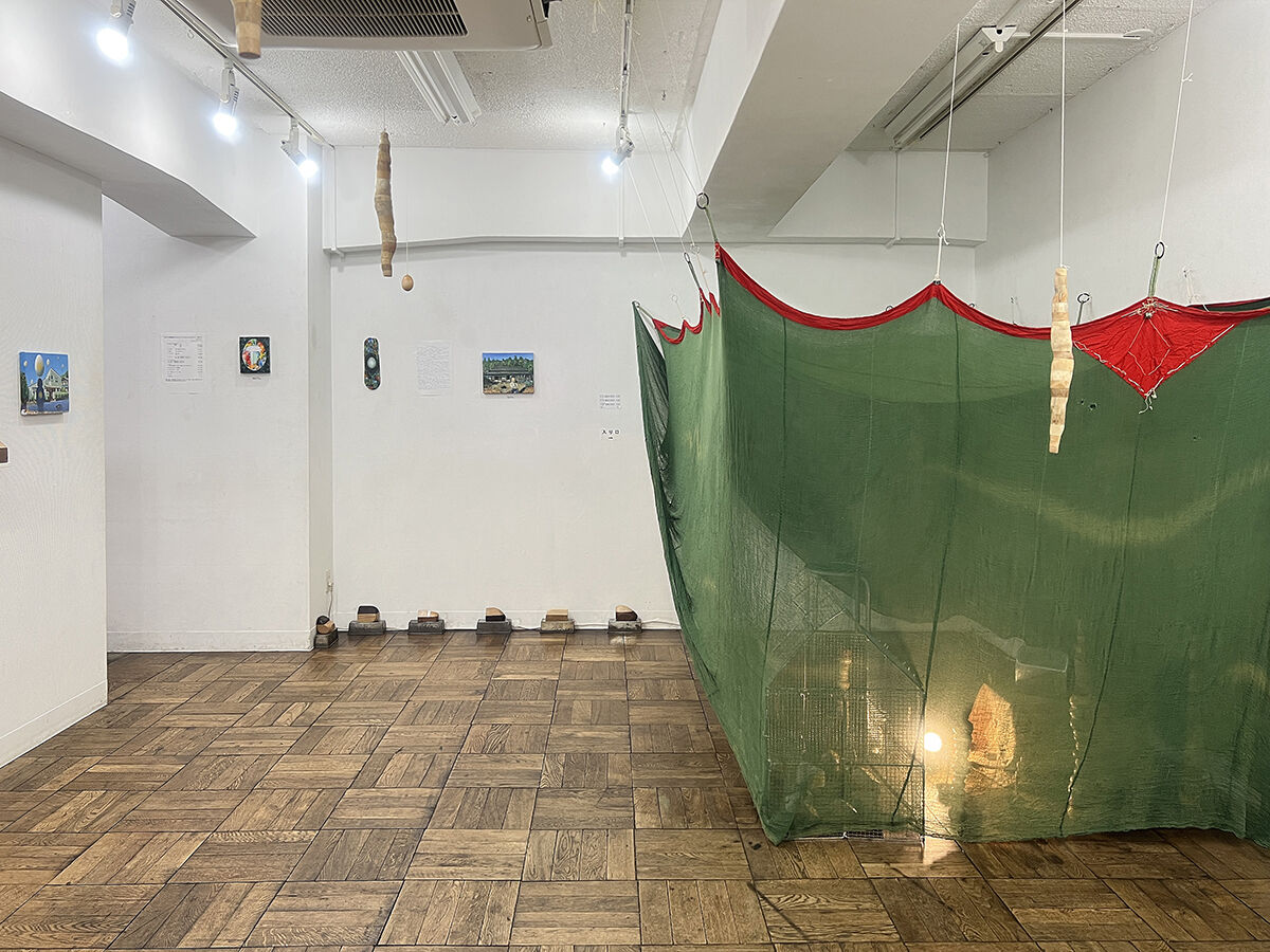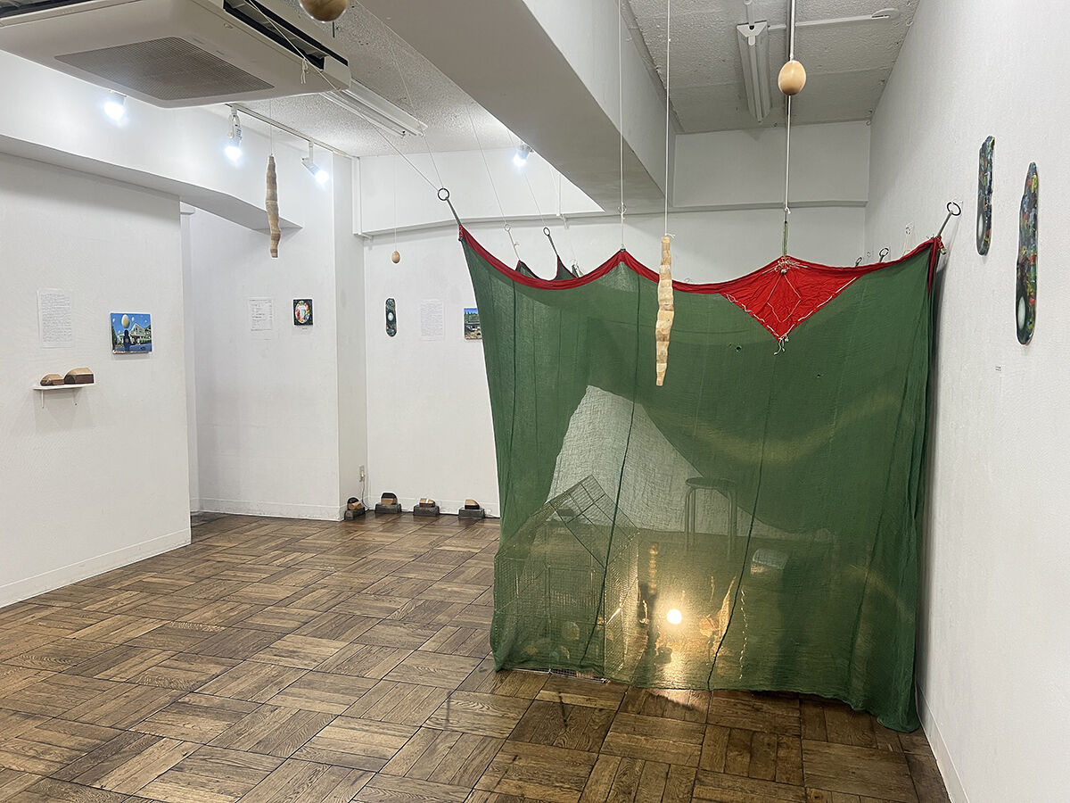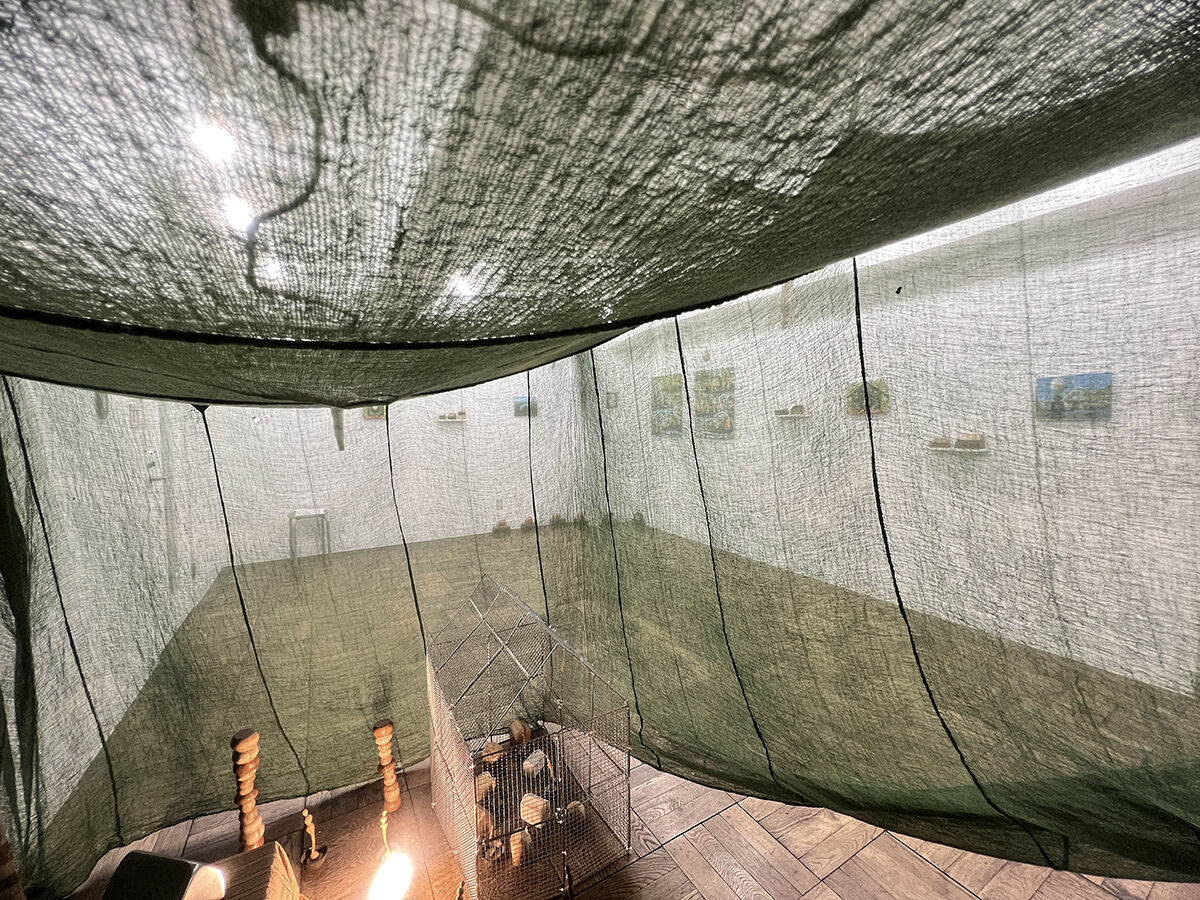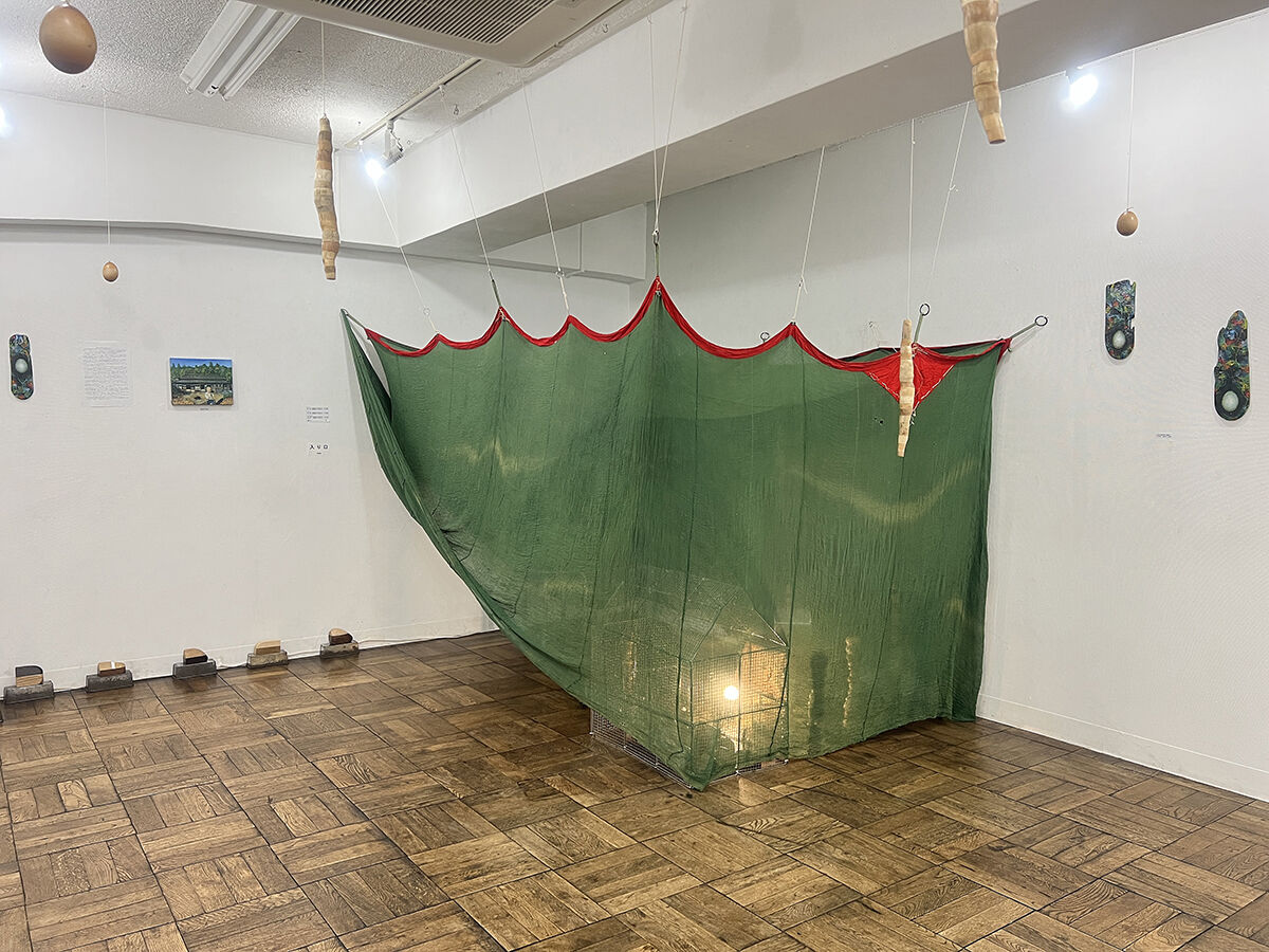 《 Return to the egg '25-1 》 蚊帳, 金網, 鉄塊, タングステンランプ, 角材, 流木, キャンバスに油絵の具, 他. / 平面, 立体, インスタレーション.