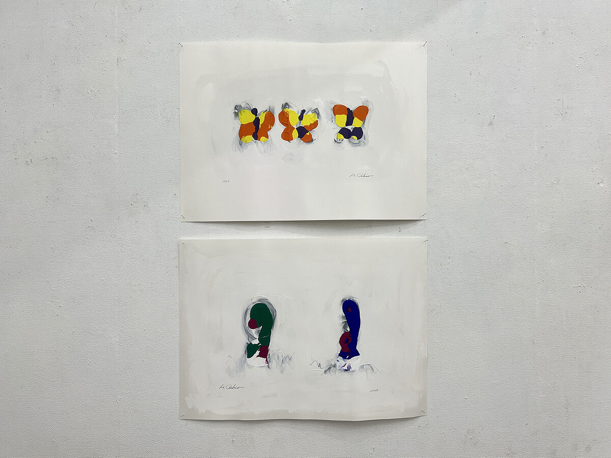 新里 陽一 紙にドローイング. 積層合板に彩色 (2022年作)